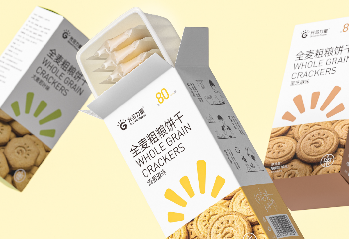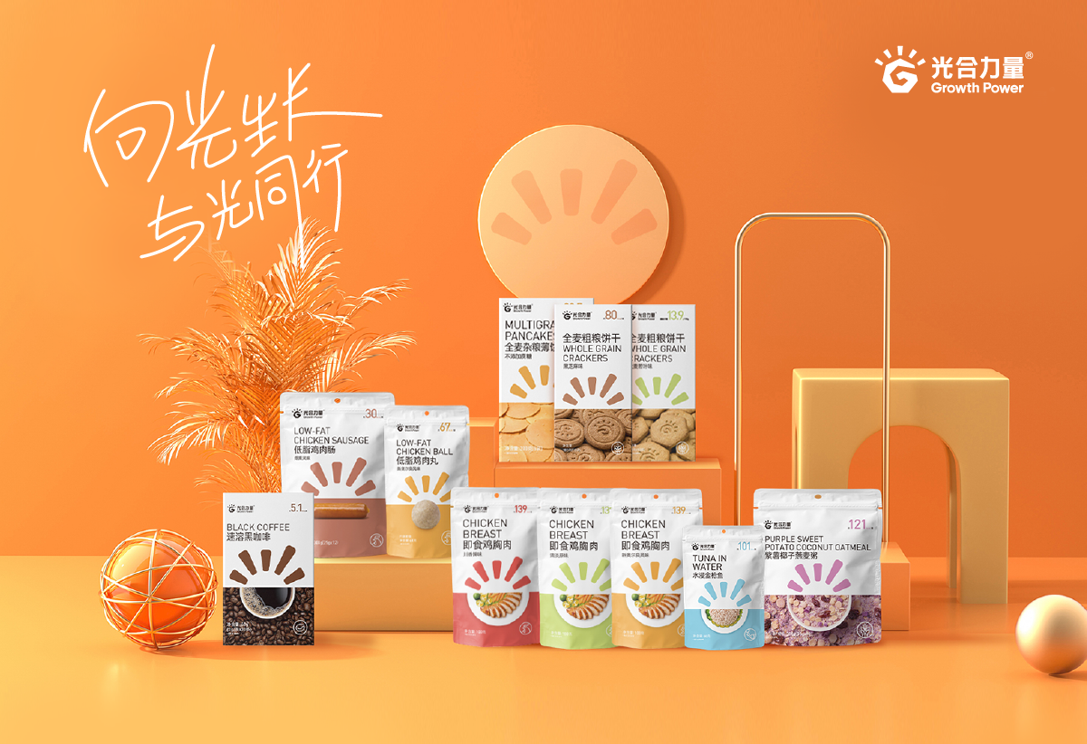 光合力量是一家健康食品品牌,為年輕的消費者提供健康方便的低脂肪產品,客戶希望通過品牌化的包裝設計提升品牌的視覺識別力以及品牌理念的認同度。布谷通過品牌名稱及標志,提煉出陽光的概念點與陽光的生活方式,并提出“向光生長,與光同行”的品牌理念。讓消費者通過陽光的符號將品牌名稱和品牌理念結合。讓品牌不僅僅是產品的提供者,更是用戶了解用戶,與用戶一起成長的伙伴。
