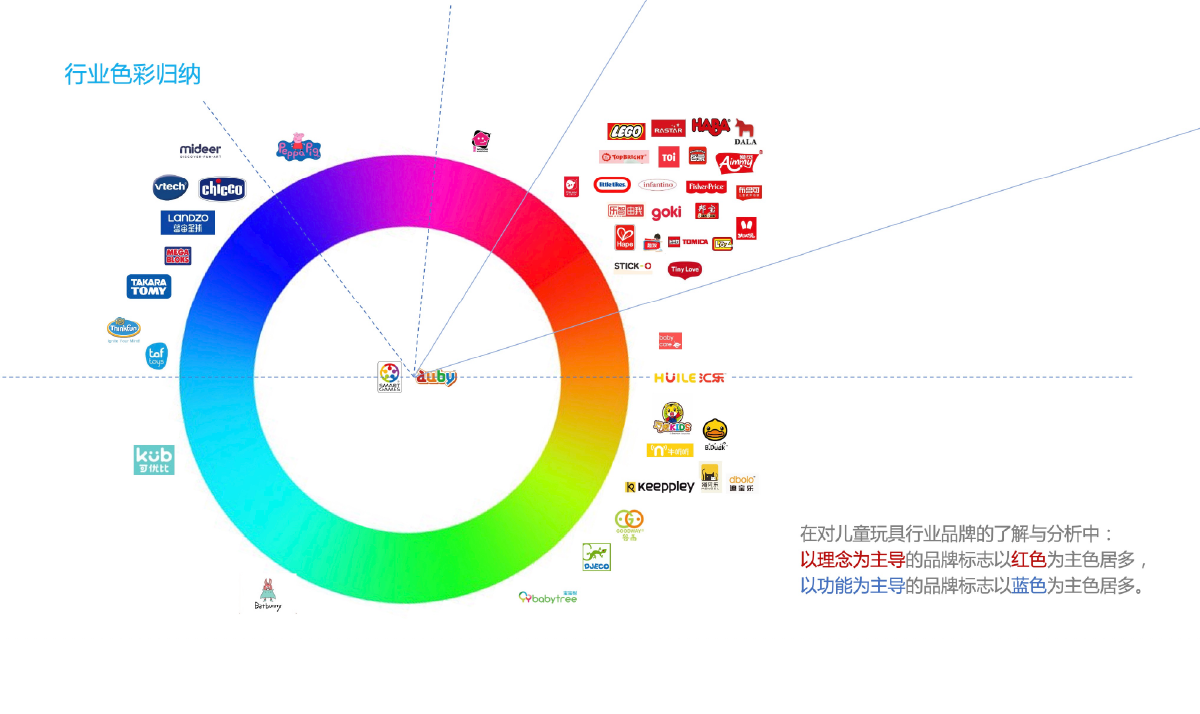 小步在家玩具作為小步早教理念的功能型產(chǎn)品,定位專注分齡進(jìn)階的兒童玩具品牌,整體強(qiáng)調(diào)功能傳達(dá)。于是我們通過競(jìng)品視覺分析,找到小步在家玩具的差異化表達(dá)。