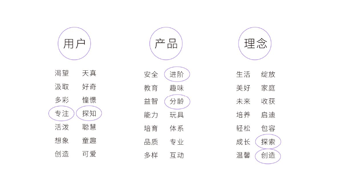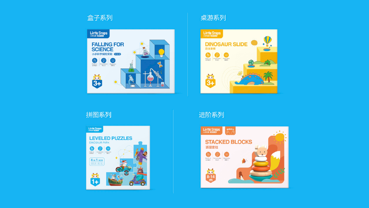 圍繞專注分齡進(jìn)階的兒童玩具,分別從用戶、產(chǎn)品、理念維度進(jìn)行關(guān)鍵詞梳理,與客戶明確“進(jìn)階益智,專業(yè)培優(yōu)“的專業(yè)、高品質(zhì)風(fēng)格調(diào)性,并以階梯概念為品牌符號(hào)進(jìn)行傳播。